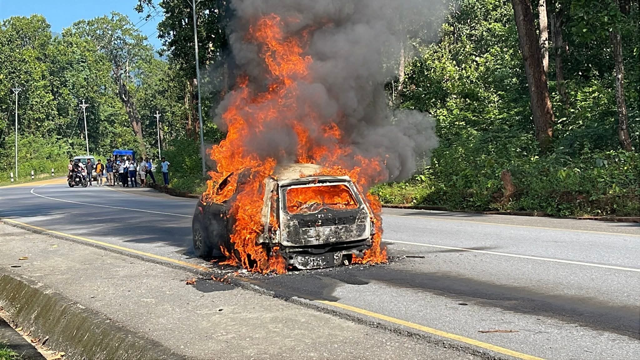 गुडिरहेको कारमा आगलागी हुँदा एक बालक सामान्य घाइते