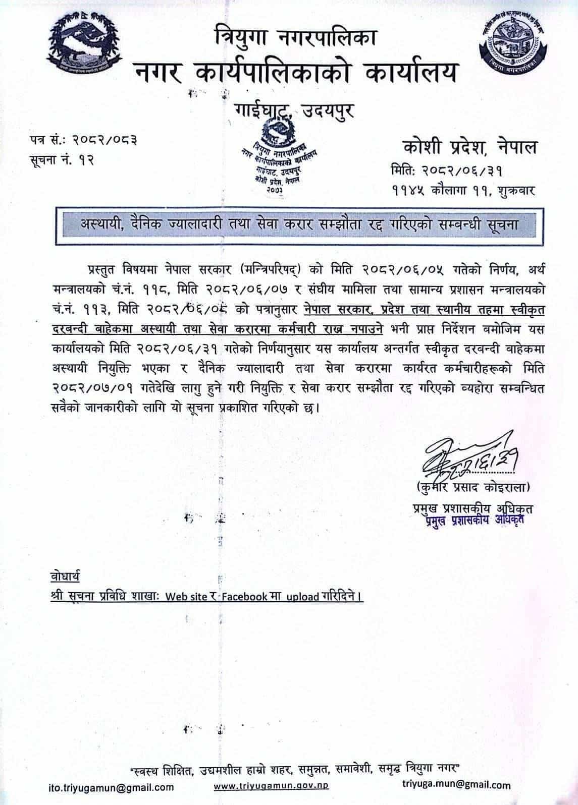 त्रियुगा नगरपालिकाले स्वीकृत दरबन्दी बाहेकका अस्थायी नियुक्ति भएका , दैनिक ज्यालादारी तथा सेवा करारमा कार्यरत कर्मचारीलाई मंसिर १ गते देखि लागू हुने गरि सेवा बाट हटाउने निर्णय गरेको छ ।