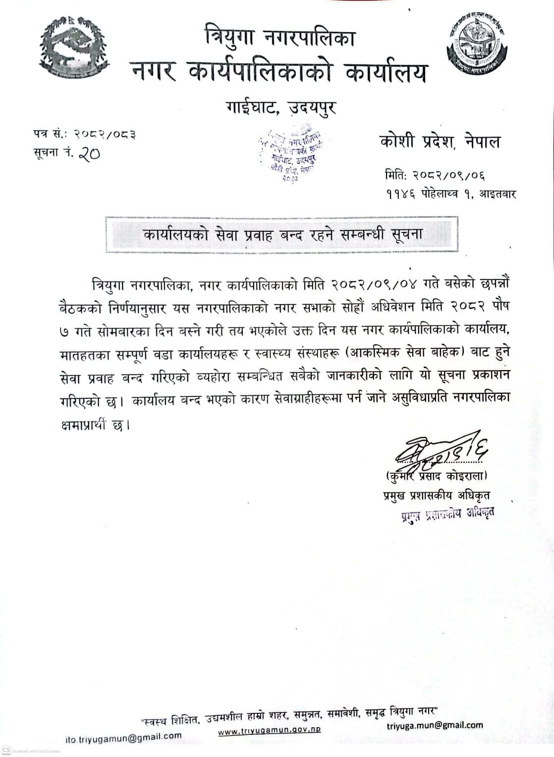 त्रियुगा नगरपालिकाले आइतबार सार्वजनिक सूचना जारी गर्दै सोमबार सबै सेवा प्रबाह बन्द गर्ने जनाएको छ ।नगरपालिकाको १६औं अधिबेशनको लागि भन्दै उक्त दिन नगर कार्यपालिका , मातहतको सबै वडा कार्यालय र सबै स्वास्थ सस्थाहरु बाट प्रदान गरिदै आएको सेवा प्रबाह बन्द रहने उल्लेख गरेको छ ।