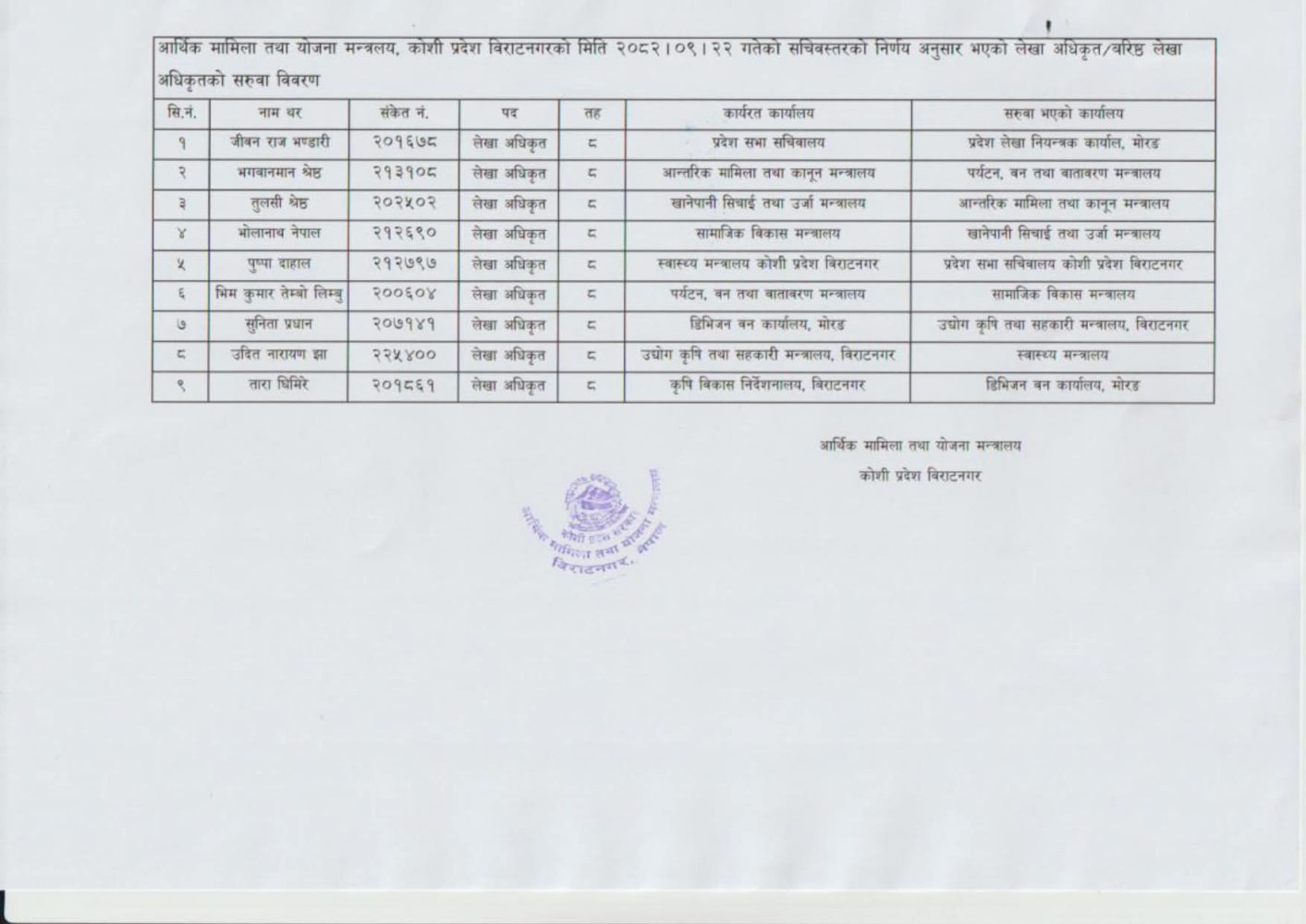 आर्थिक मामिला तथा योजना मन्त्रालयले ५० जना लेखा अधिकृत तथा लेखापालको सरुवा गरेको छ । कोसी प्रदेश भित्रका विभिन्न जिल्लामा कार्यरत लेखा अधिकृतहरुको मन्त्रालयले मंगलबार सरुवा गरेको हो ।