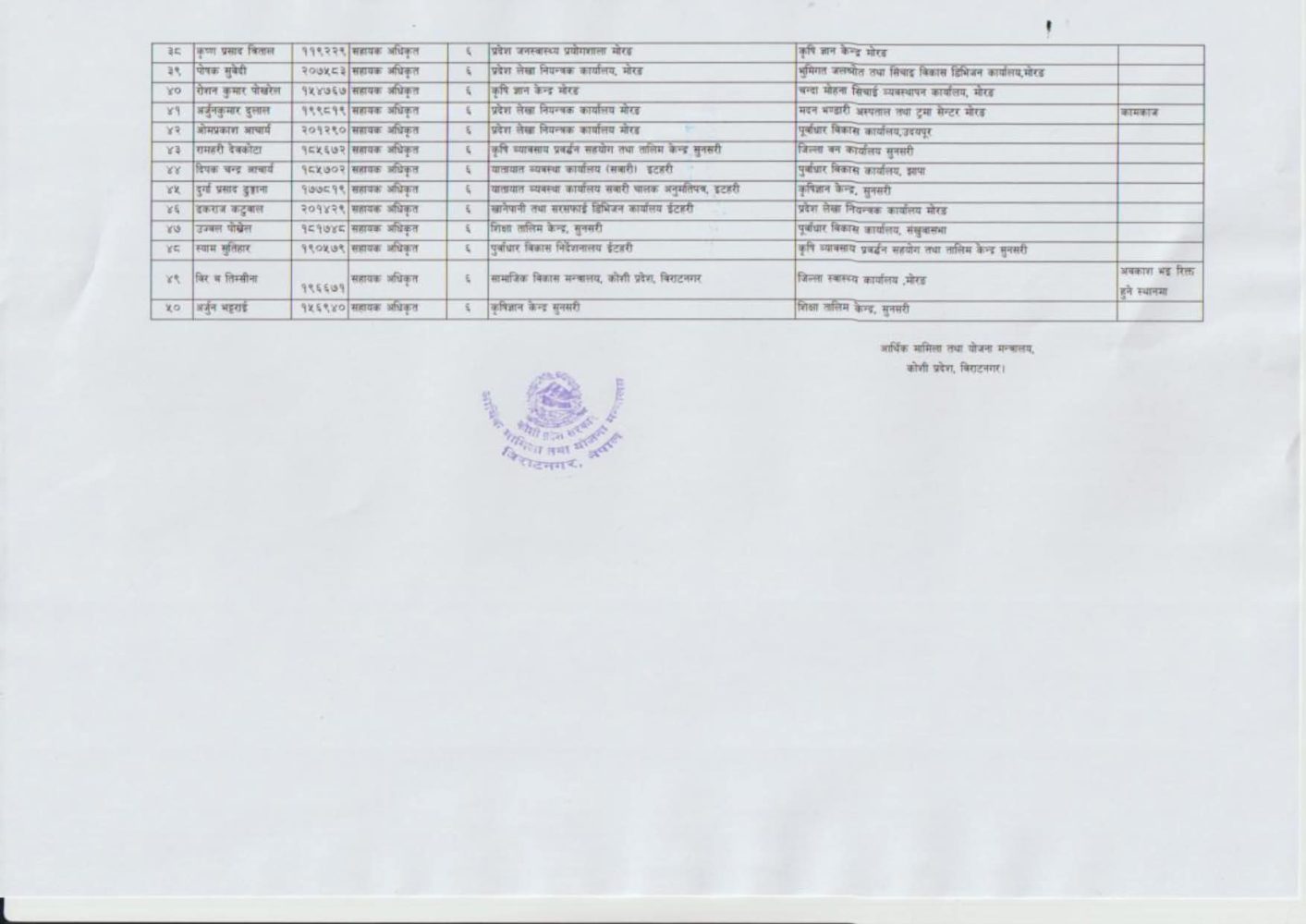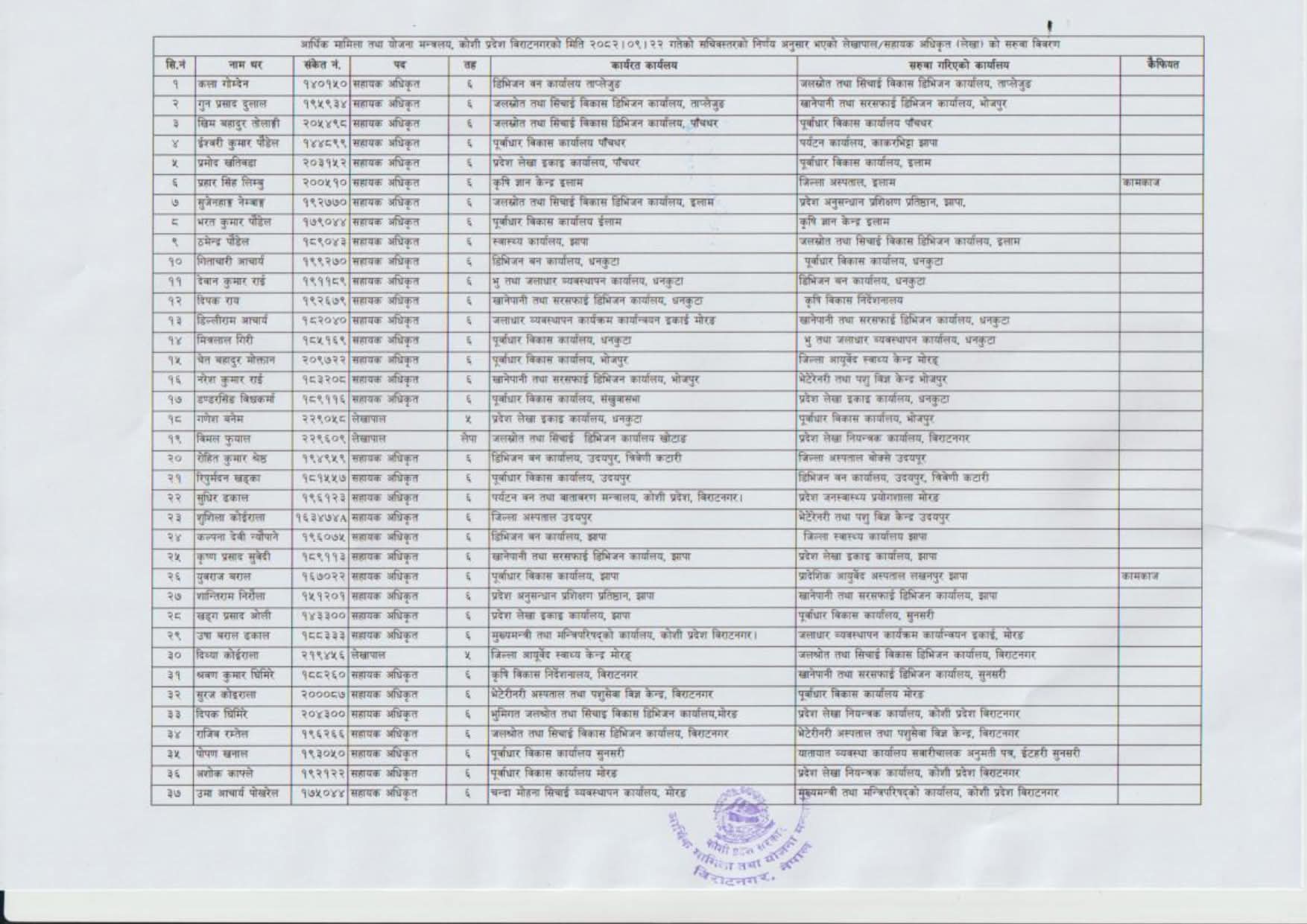 डिभिजन बन कार्यालय त्रिबेणी उदयपुरमा कार्यरत सहायक अधिकृत रोहितकुमार श्रेष्ठको जिल्ला अस्पताल उदयपुरमा र उदयपुर अस्पतालकी शुशिला कोइरालाको भेटेनरी तथा पशु बिज्ञ केन्द्र उदयपुरमा सरुवा भएको छ ।