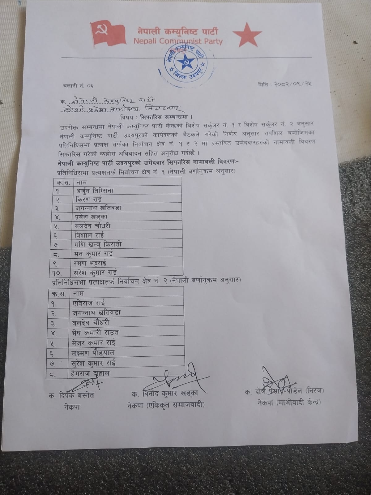 नेकपाको तर्फ बाट दिपक बस्नेत र नेकपा एसको तर्फ बाट बिनोदकुमार खडका द्वारा प्रदेश कमिटीलाई लेखेको पत्रमा उक्त प्रस्तावित नाम पठाइएको ब्यहोरा उल्लेख छ ।