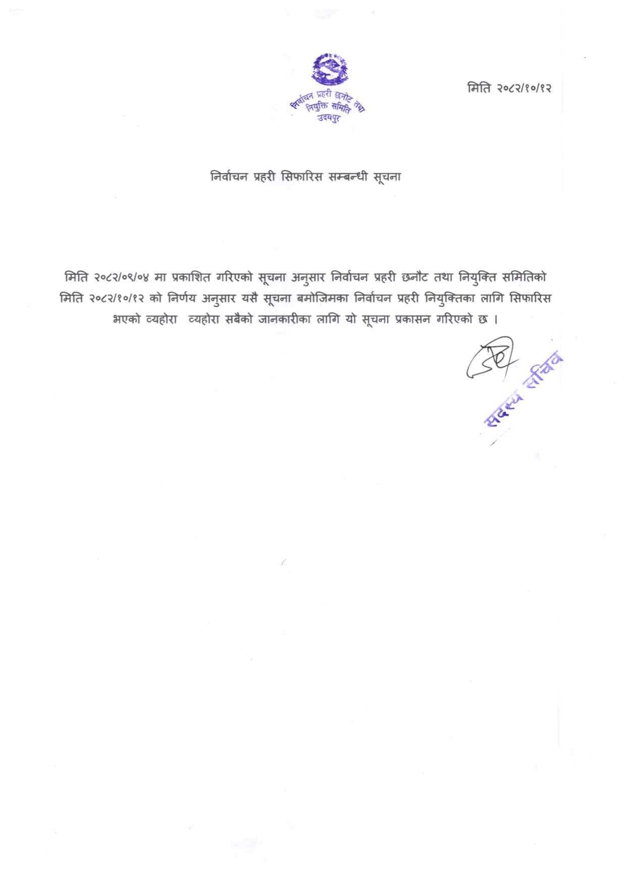 समितिले गत पौष ४ गते सूचना प्रकाशित गर्दै निर्वाचन प्रहरीको माग गरेको थियो । सबै प्रक्रिया पुरा गरि सफल उमेदवारको नाम सार्वजनिक गरिएको समितिले जनाएको छ ।