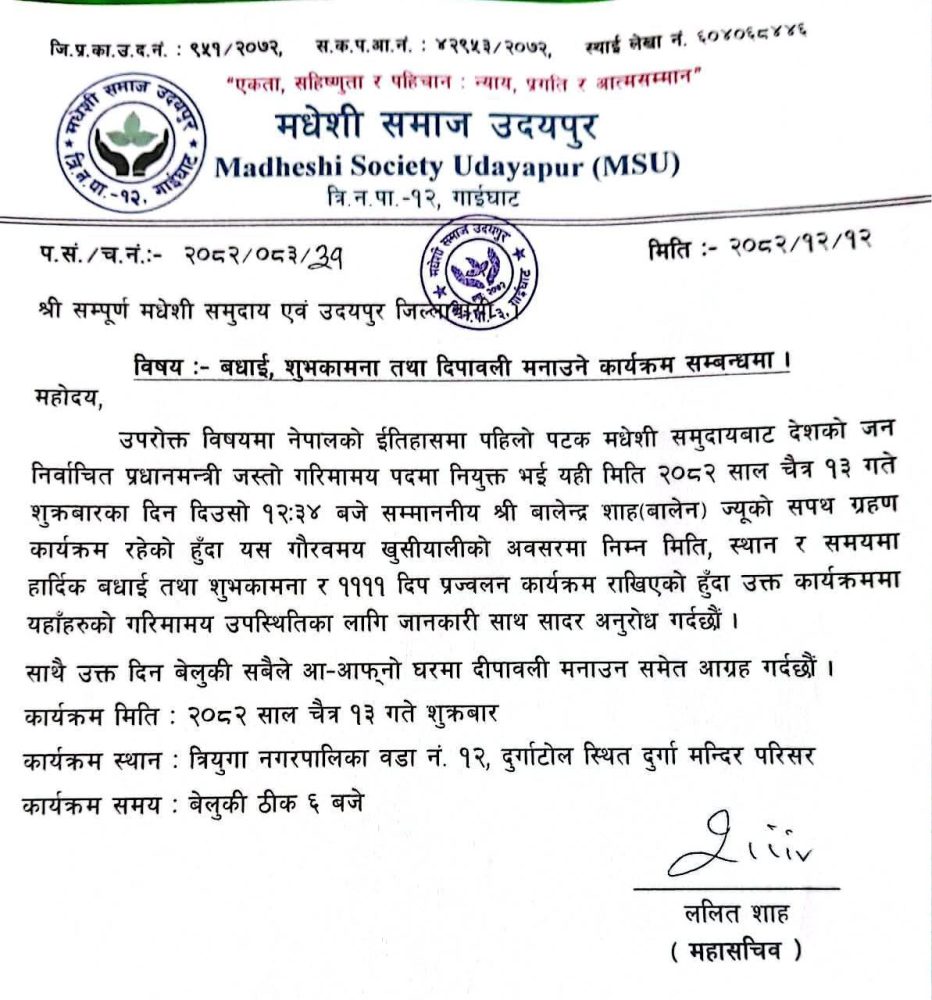 उनले बधाई तथा दिपावली मनाउने कार्यक्रम राखिएको र साझपख घरघरमा दिपावली गर्न मधेसी समुदायलाई आग्रह गरिएको बताए ।