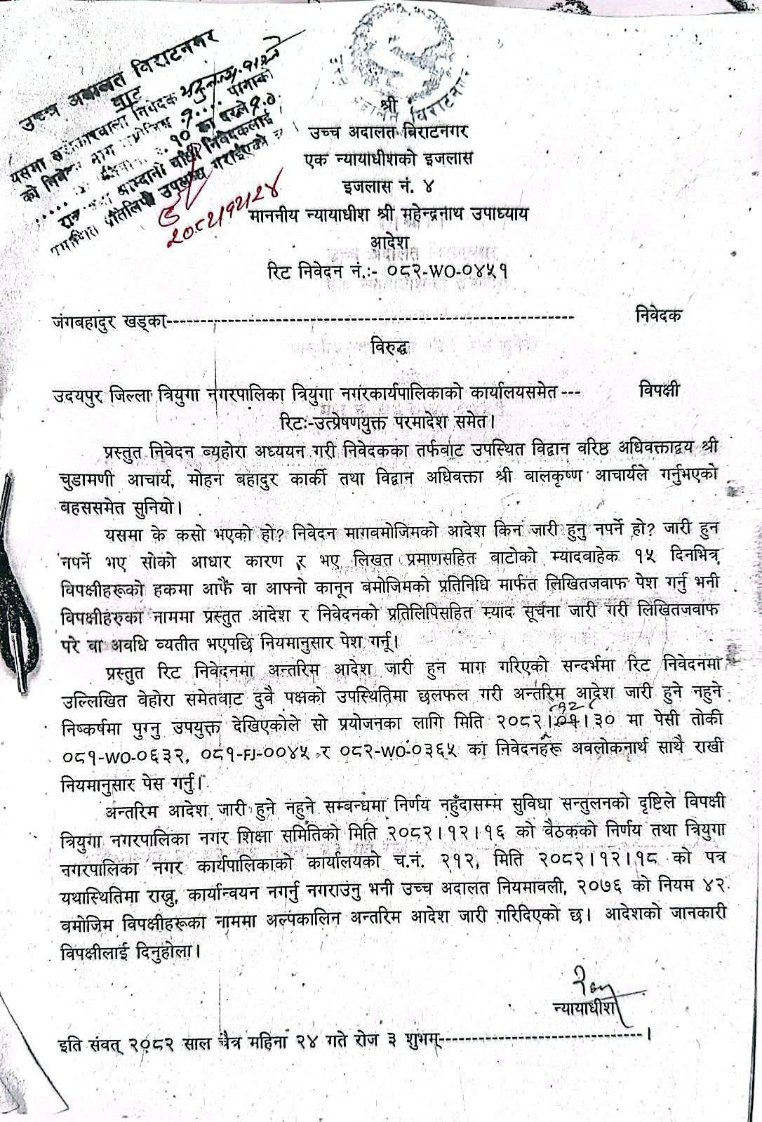 त्रियुगा नगरपालिकाले बालमन्दिर माध्यमिक बिध्यालयका प्रधानाध्यापक जङ्गबहादुर खड्कालाई सो पद बाट हटाएको बिषयमा उच्च अदालत बिराटनगरले अल्पकालीन जारी गरेको छ ।